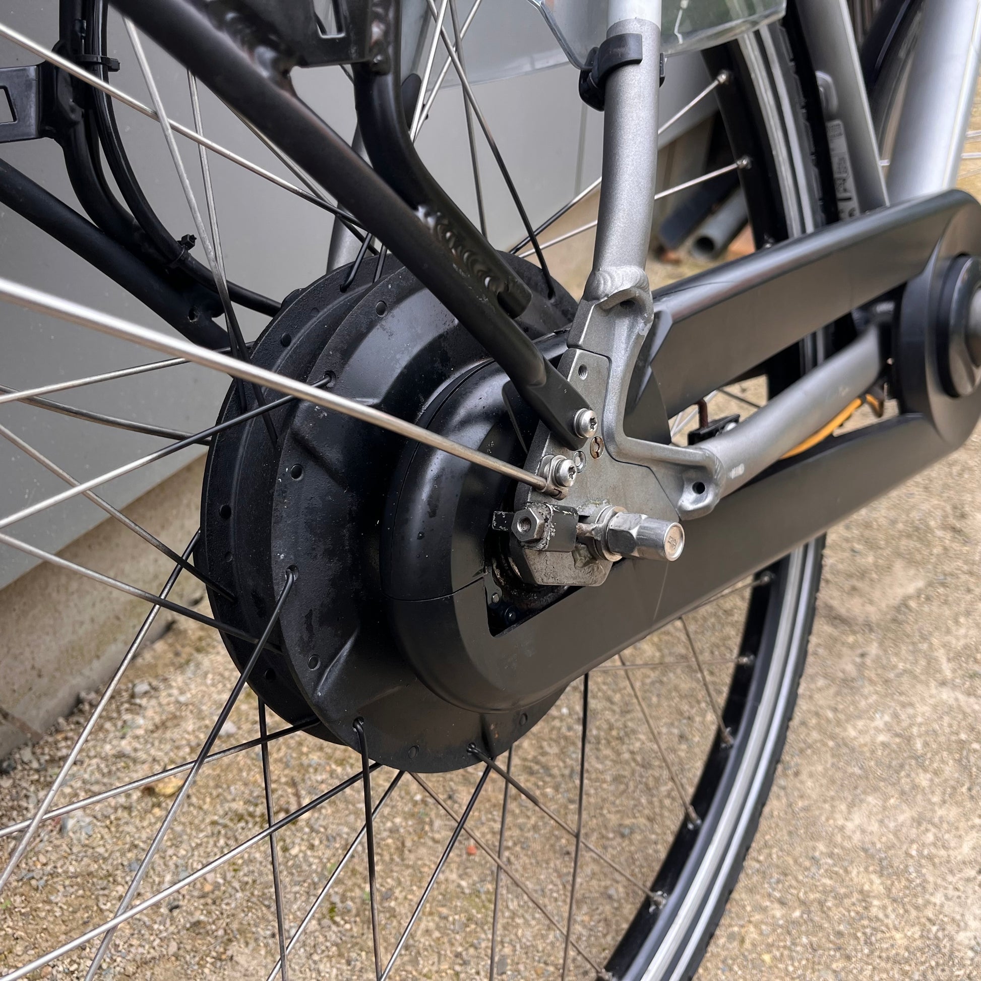 Mooie herenfiets met een sterke achterwiel motor.